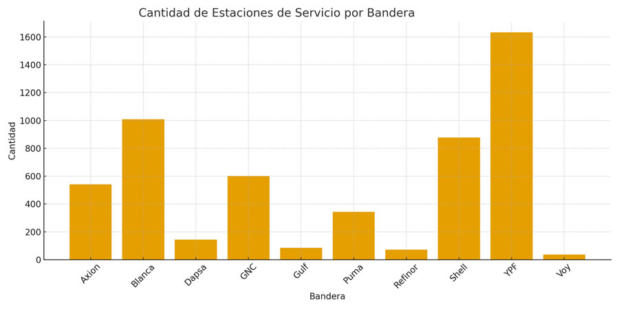 Detrás se ubican Shell (877), Axion (541), Puma (344), Dapsa (144), Refinor (72), Gulf (84) y Voy (37), evidenciando una red robusta en términos de actores y opciones de abastecimiento. La coexistencia de grandes compañías con operadores regionales marca una estructura diversa, donde la competencia se expresa tanto en precios como en servicios, imagen comercial y oferta complementaria.