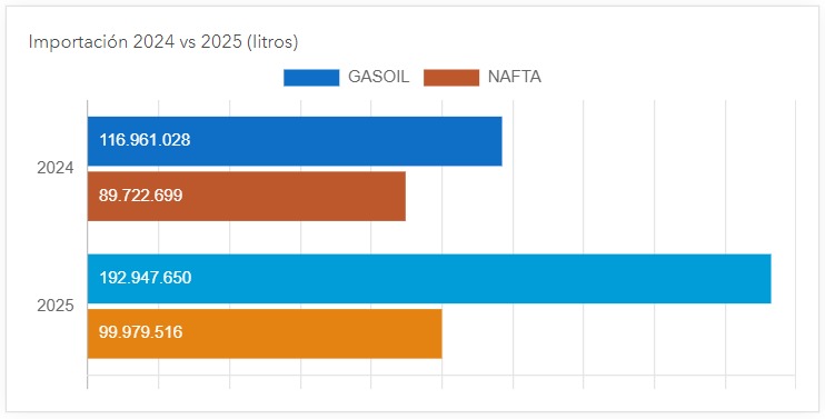 Un dato no menos importante del cierre de 2025 es que, pese a la caída económica del valor total importado, los volúmenes crecieron de forma significativa. El gasoil pasó de 116.9 millones de litros en 2024 a casi 193 millones en 2025, mientras que las naftas también mostraron un incremento interanual.