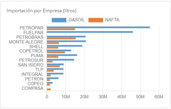 El mercado de importación de combustibles en Paraguay continúa liderado por empresas estatales y multinacionales con fuerte presencia en el país, destacándose PETROPAR como el principal importador, con aproximadamente 60 millones de litros de Gasoil y 7 millones de litros de Nafta; le sigue FUELPAR, PETROBRAS, MONTE ALEGRE, SHELL, COPETROL y PUMA.