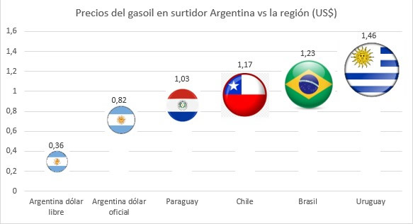 Utilizando el tipo de cambio del dólar contado con liquidación como referencia, el precio del litro de gasoil en Uruguay supera en un 305 por ciento al de Argentina. En Brasil, la diferencia es del 242 por ciento, en Chile se ubica en el 225 por ciento, y en Paraguay, alcanza el 186 por ciento.